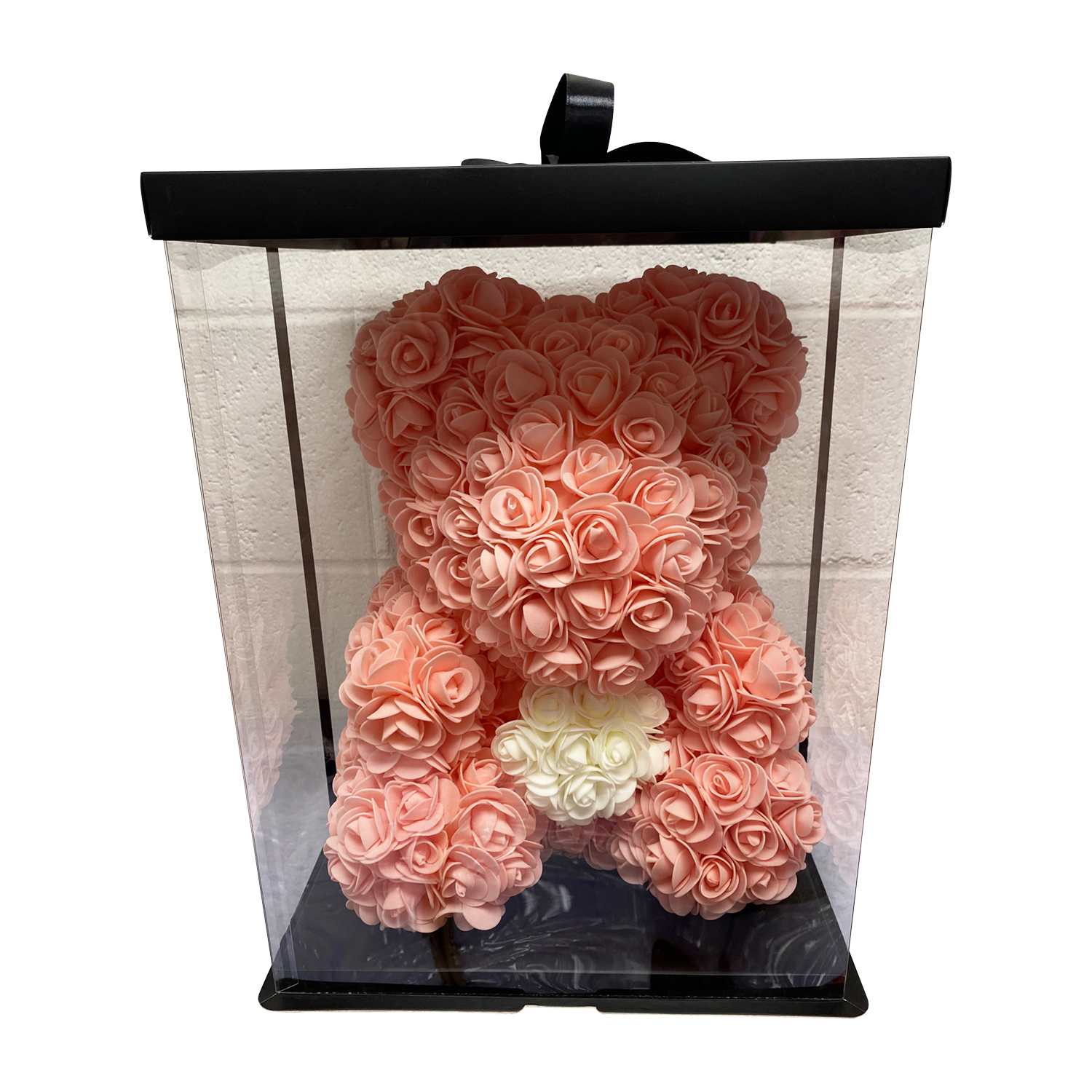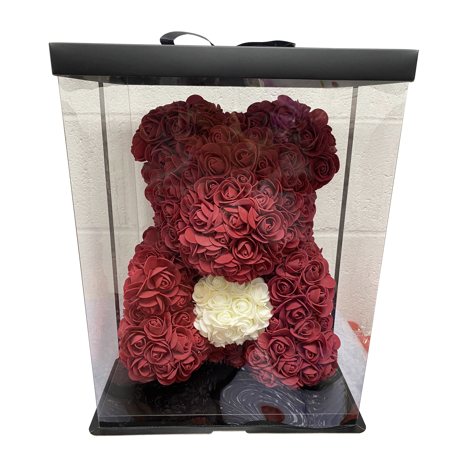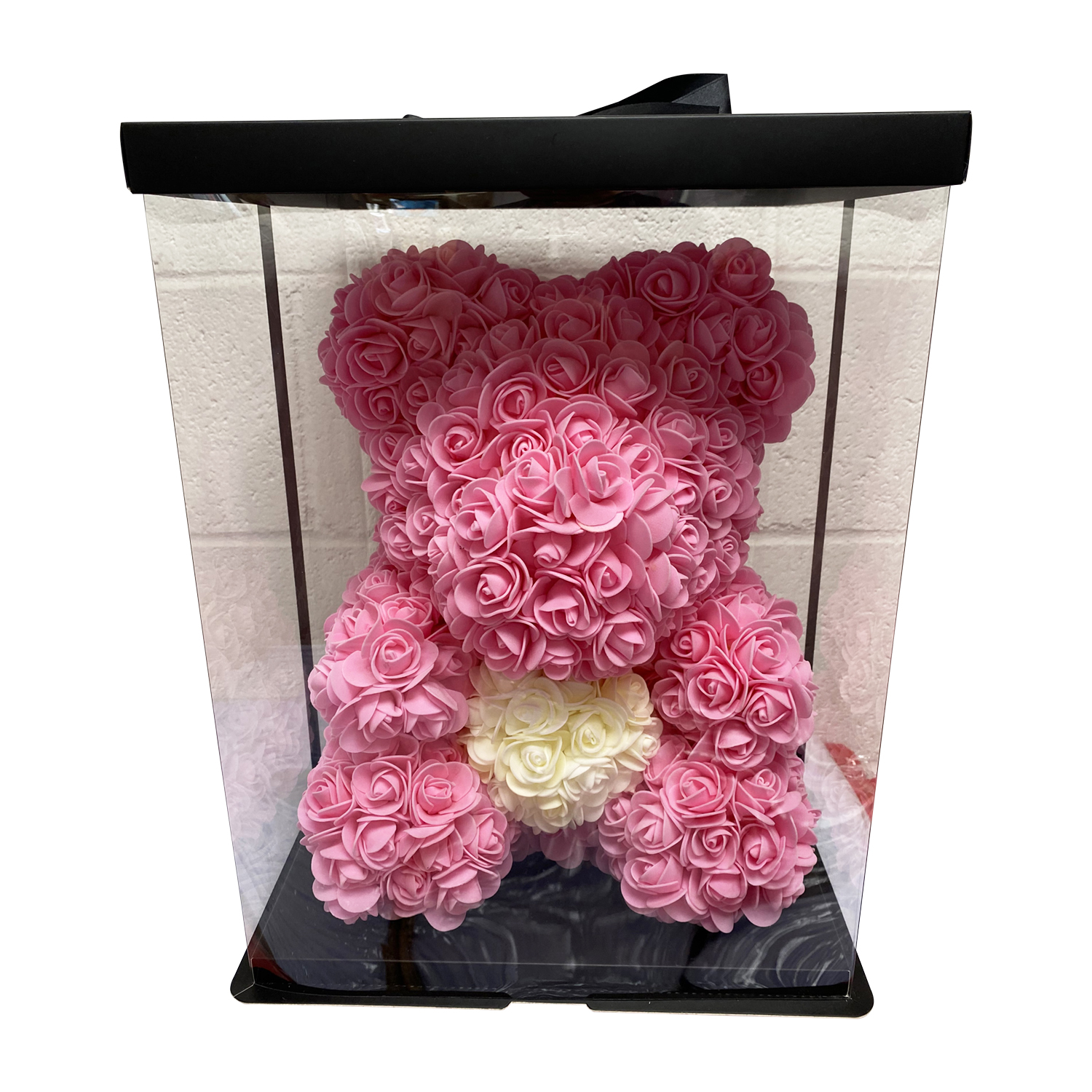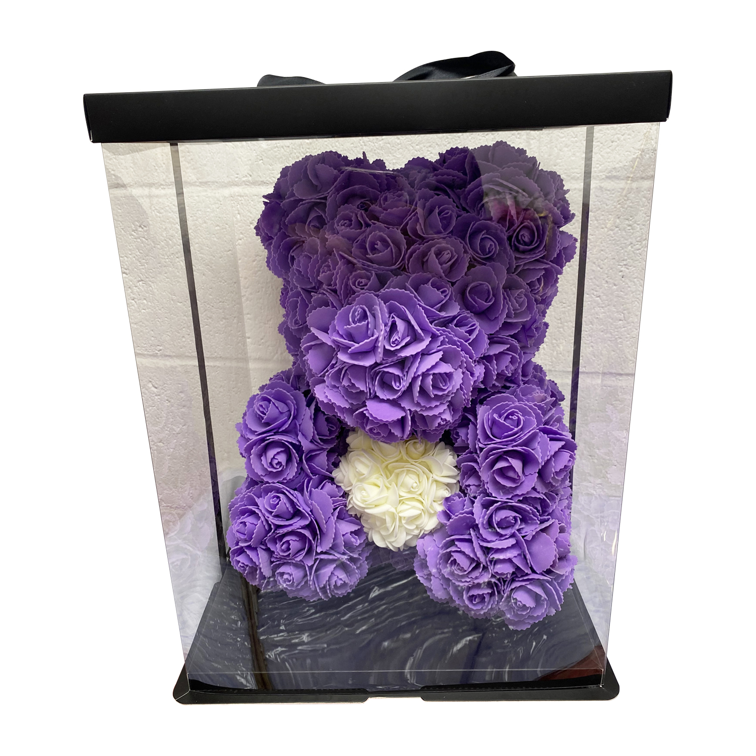 14″ tall bears that come in Lavender, Blue, Light Pink, and Hot Pink, White, Red, and other colors. Gift box for the bear is included, but you must assemble yourself. All medium sized rose bears comes with a heart shape in the middle of the bear.