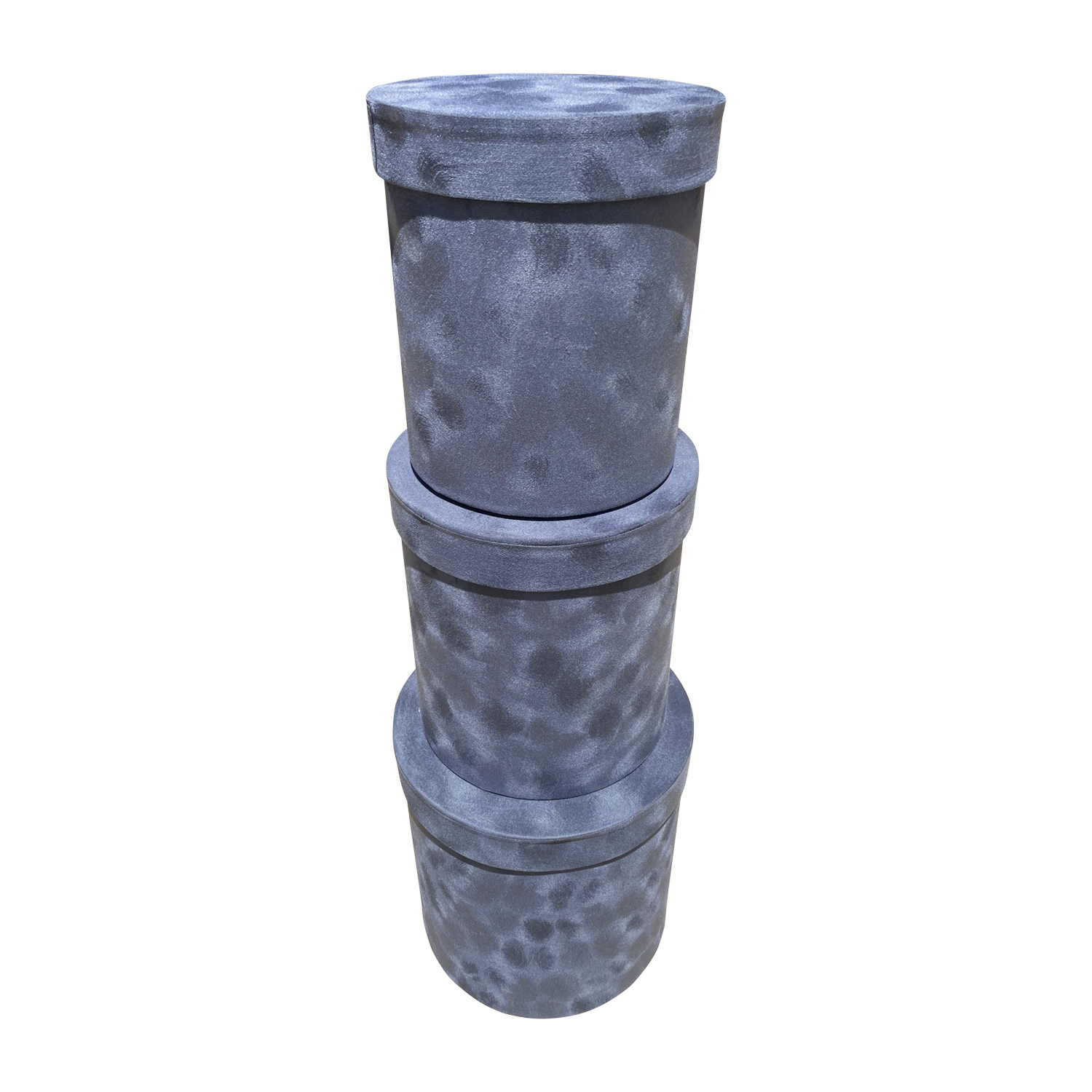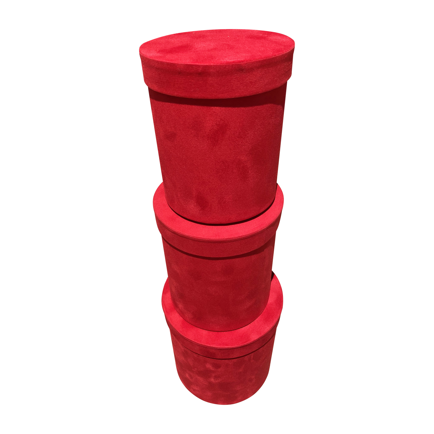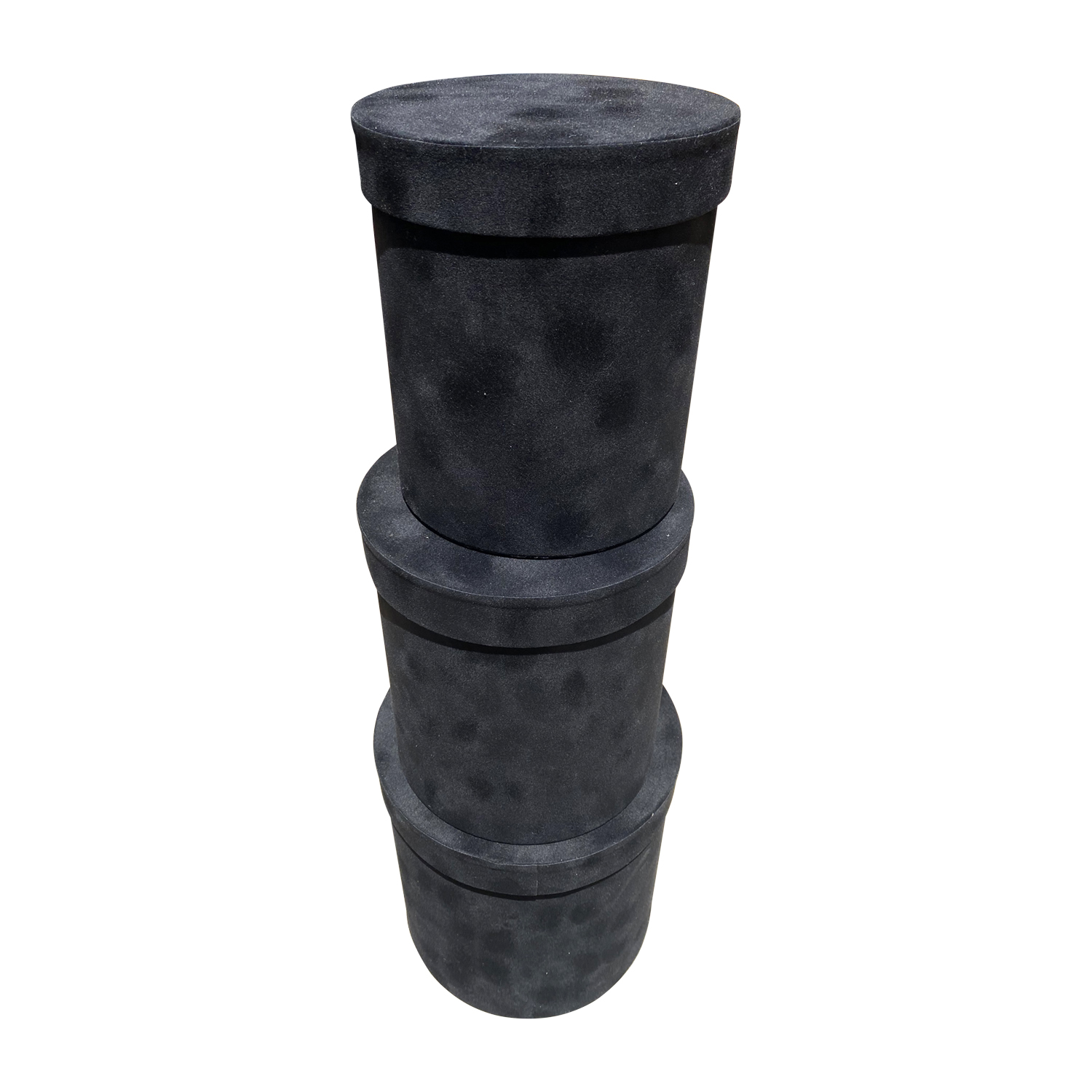 Narrow, cylinder-shaped velvet coated boxes available in sets of 3. The sizes of each of the three boxes from smallest to largest within a set are: