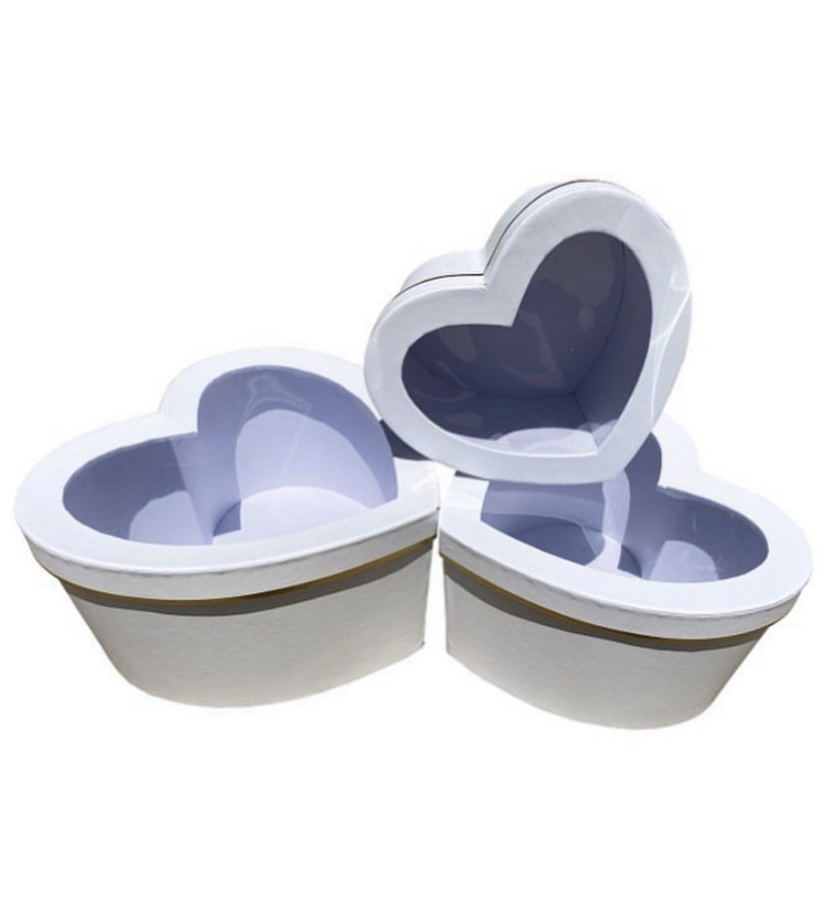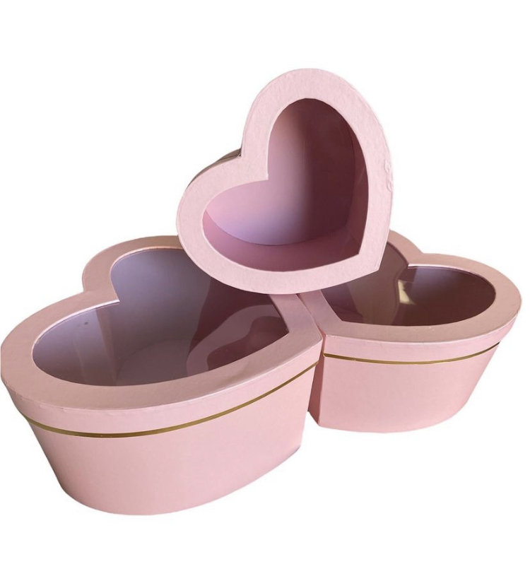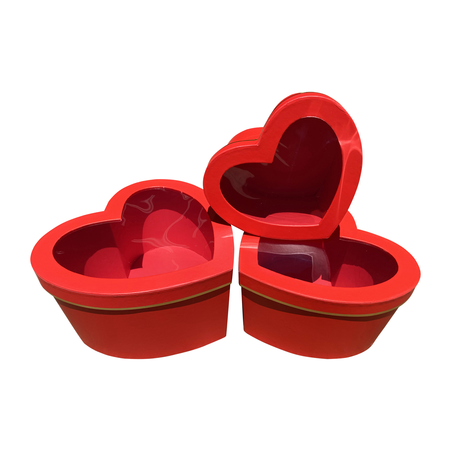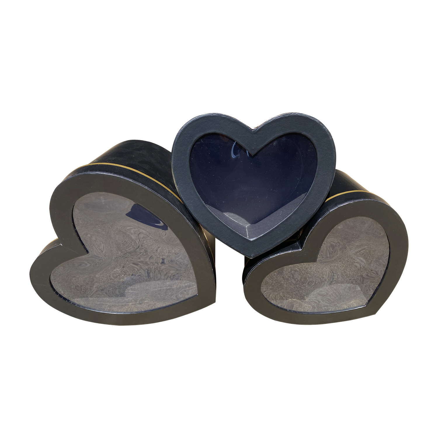 Heart boxes that come with clear lids. Colors available are black, white, red and pink. Sold in sets of 3. Size of each box in a set from smallest to largest are: